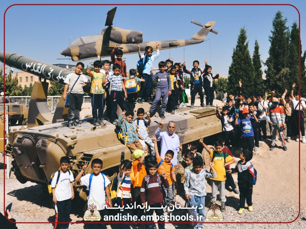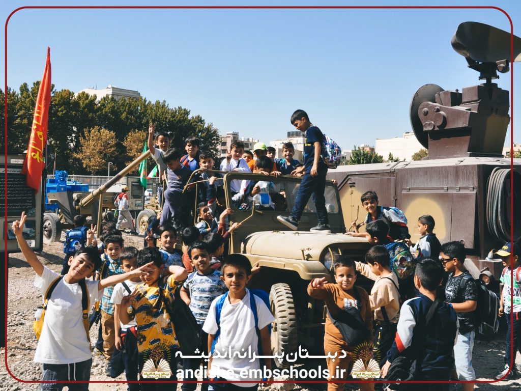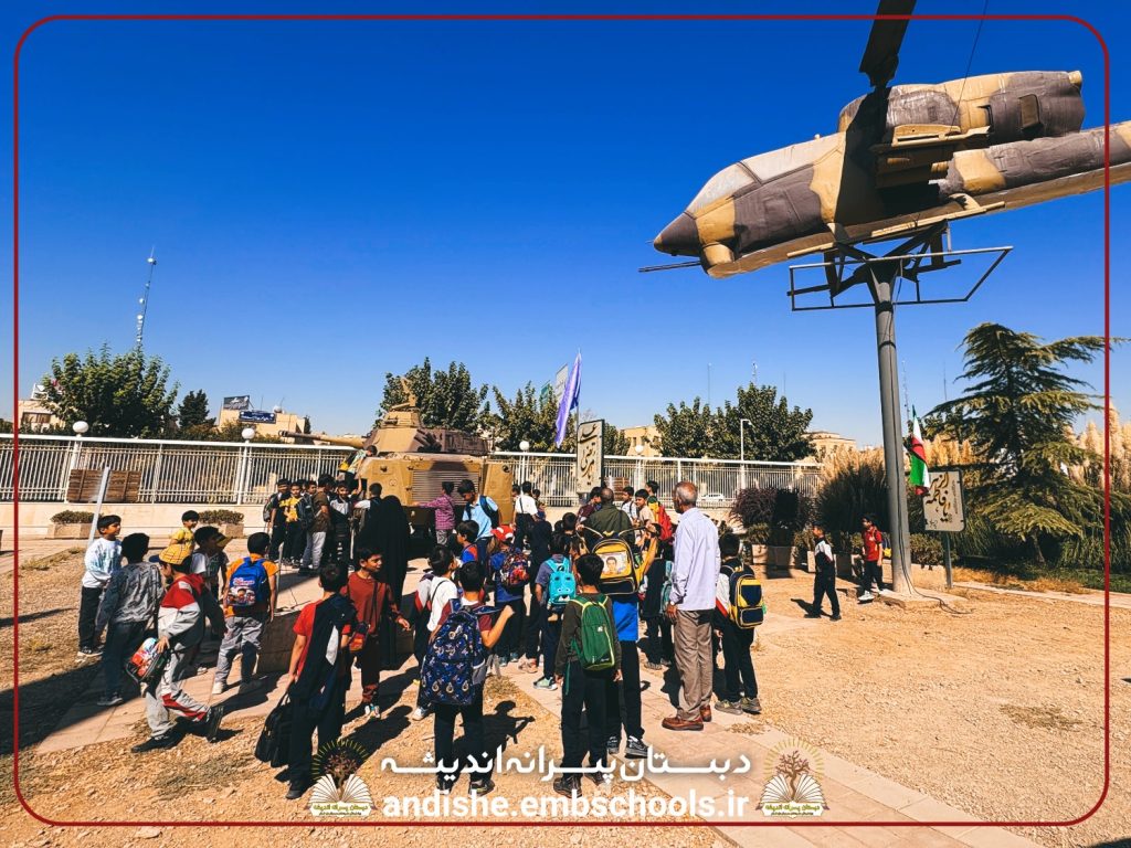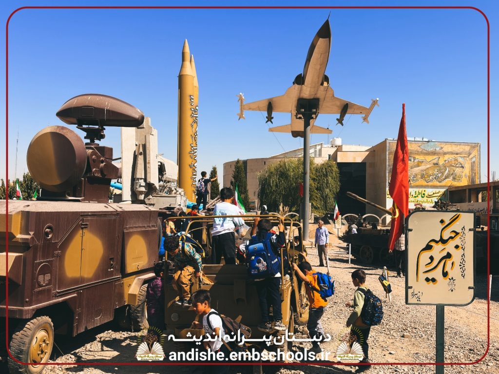 بازدید از موزه دفاع مقدس و عکسهای یادگاری با ماکت ها و آثار دوران جبهه و جنگ – کاوشگری های بامزه درس علوم در فضای باز – بازیهای دورهمی و گروهی در فضای باغ غدیر مثل دیوار پنالتی و گلکوچیک ۳ به ۳ و…